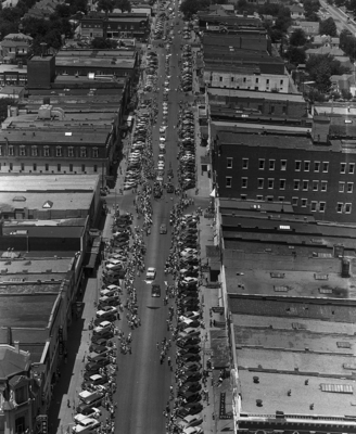 General Eisenhower is greeted by cheering Texans at Denison Saturday as he returns to his birthplace. Aerial shot of the general riding in the first convertible of the parade.