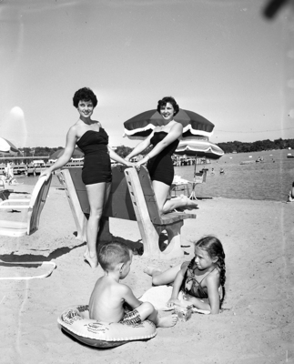 Casino Beach Bathers - Taking advantage of the sun, the beach and the water at the Casino playground are little Wayne Hueppelsheuser of 4118 Fox Drive, Hazann Chapman, 8, daughter of Captain J. S. Chapman with the Army in Korea and Mrs. Chapman of 4012 Wayside, and Miss Jane Smith, standing left, daughter of Mr. and Mrs. Clifford W. Smith of 2221 Wilshire Boulevard, and Miss Lois Ann Ward, daughter of Mr. and Mrs. Russell Ward of Forest Park Boulevard.