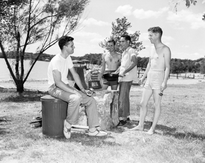 Food cooked outdoors tastes better than any other kind especially after a swim and some beach sports. This quartet of men who share a cabin at Eagle Mountain Lake, left to right, Thomas O. Anderson, Louis Di Stefano, Joseph C. Idiaquez, and Robert A. Robinson, enjoy the outdoor life lake living affords.