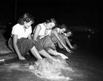 When a water main burst Monday night at University Dr. and crockett these three girls took advantage of the situation by doffing footgear and cooling off. They are left to right, Joan Loffland, Kaye Buck, and Jo Ann Cone.