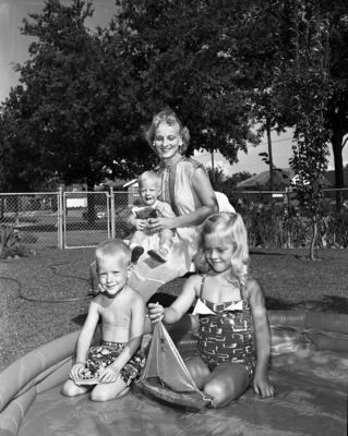 Mrs. Cecil B. Greer of Houston holding year old son, Spencer, with Larry, 3, and Lynn, 5, in the pool. They are visiting her mother, Mrs. Rudy Copeland Jr., for a few weeks. Greer will join his family here later.