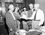 Uel Stephens, diector of the Fort Worth Water Department, extreme left, Tuesday presented checks totaling $2,400 to City Chemist W. S. Mahlie, extreme right. The money will go to the Egmont S. Smith Memorial Scholarship Fund. Others, left to right, Mrs. Uel Stephens, Jack Wood, water department fiscal officer, and Marvin Nihcols.
