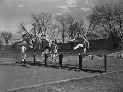 North Side's Val Martin, left, and Donald Nored clear last barrier in 200-yard low hurdles race. Martin won, Nored was second. Martin also won 120 high hurdles and high jump. Published in the Fort Worth Star-Telegram morning edition, March 29, 1950.