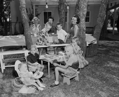 Left to right are, Mmes. Joe Day, J. A. Durkin, and Frank Thompson, and small fry, left to right, Lehnen Day, Pete Thompson, Marshall Day, Mac Thompson, Kathy and Mike Durkin.