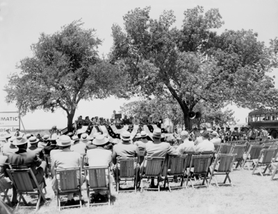 Crowd; Chairs; Stage; Trees; Bus; Mayors; Speeches
