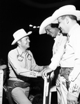 Ray Woods, center, greets Lee Price of Swainsboro, Ga., left, national Jaycee president, as Raymond Roberts of Grand Prairie, state president, looks on. Some 6,000 Jaycees attending the national convention in Dallas this week saw the fifth annual Audie Murphy Rodeo near Euless Wednesday night. The rodeo is stages on Woods' ranch.