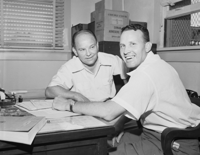 Clifford Johnson, right, newly named head coach at Fort Worth Tech, and Herman Clark, atheltic director for city schools, talk over Johnson's new duties. Johnson succeeds Johnny Stovall who will beocme an assistant coacha t Arlington Heights.