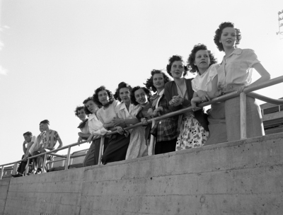 These Tech co-eds lean over the Farrington Field rails to shout encouraging cheers for the Bulldog track performers. They are left to right, Beverly Rutledge, Nancy Bargsley, LaVera Mullins, Barbara Hamm, Jo-Ann Allen, Patsy Fuller, Wanda McClung, Dolores Head and Mary Jane Gregeory.