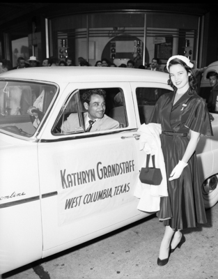 Texas Lions Queen Miss Kathryn Grandstaff of West Columbia stands by the car she rode in at the Lions International Convention parade in Mexico City. Miss Grandstaff was "Miss Texas League of 1951."