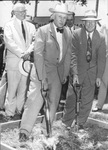 Chicago Pneumatic Tool Company ground breaking ceremony - W. P. Bomar, Katy Railroad director, and Charles W. Knowles, vice president of Walter Kidde Constructors, Inc., with D. V. Fraser of St. Louis, Katy president, in background, 06/26/1952.
