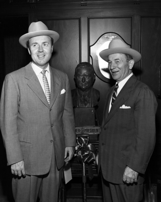 W. L. Lewis, right, Chicago Pneumatic Tool Company president, who Thursday posed for this picture at the Start Telegram Building before flying to his New York office, died Saturday morning shortly after being taken to a hospital there. At left his son, James L. Lewis who accompaniied him here for groundbreaking ceremonies for the company's new $4,500,000 Fort Worth Plant.