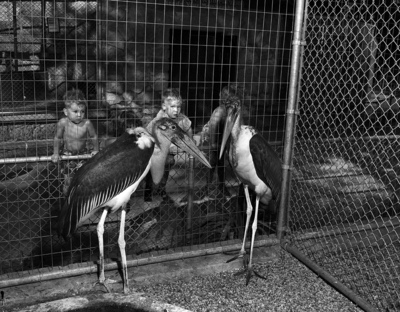 , stalked two of the birds to their home in Forest Park Zoo Thursday. The birds, unfortunately, were fresh out of their supply of little brothers and sisters, so the children just had to be satisfied with a good look at the new exhibit.