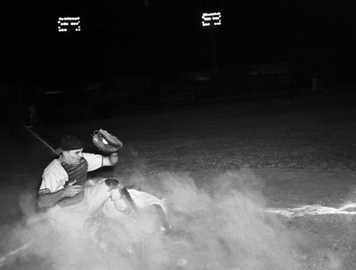Partly hidden by dust and catcher Danny Baich is Odbert Hamric, Cat outfielder who is out at the plate as he tries to score in the first inning of Thursday night's game at La Grave Field. Hamric is trying to score from second on Bill Hunter's single to right.
