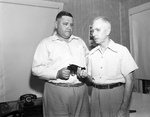 Jake Rafferty right, 59 year old, victim of a shakedown racket, was saved from further extortion Saturday morning by his landlord, B. Felps, left, and a.38 caliber pistol.