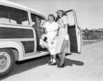Bobbie Jo Richeson, 15, daughter of Mr. and Mrs. J. . Richeson, boards a Red Cross Motor Corps station wagon for Camp Yo-Wo-Chi-A at Eagle Mountain Lake. Mrs. J. P. McClure, left, and Mrs. B.T. Floyd, are among volunteer workers who made the blond child with polio vacation possible.