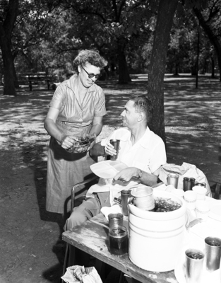 Mrs. Homer Crouch, who lives on the Waco Highway, hands a piece of chicken to Bill Stalcup, Wichita Falls, at the third annual picnic of the Cheerleaders Club Sunday. Mrs. Crouch is a "grandstander," one of several adults who support the club.