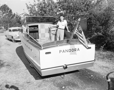 Raymond White, poses proudly with Pandora, the 21 foot cabin cruiser he spent several months building so he could participate in July 4 celebrations on the water.