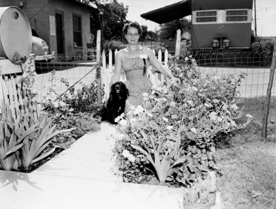 Trailer park gardener - Mrs. Tip Gray is shown here among the petunias and holyhocks which helped her to win first prize in the Hacienda Trailer Park beautiful yard contest.