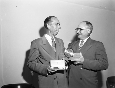 E. T. Stearns, left, who served his last day Monday as district director of the Federal Housing Administration, receives going away gifts, given by the members of his staff here and over the district from his successor, O. A. Gassaway, during a brief farewall session in his office.