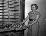 Mrs. Hardy Tidwell checks trays of turkey poults that are about to be taken from the hatcher on the Tidwell's Eastland County turkey farm.
