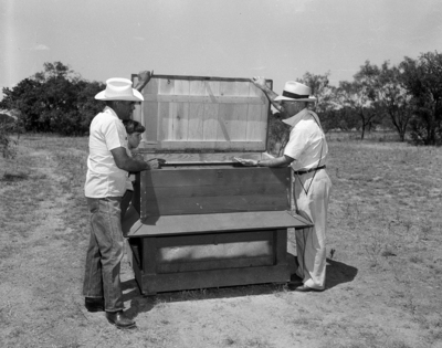 Hardy Tidwell and his daughter, Carol Sue, talk about turkey feeding with Eastland County Agent J. M. Cooper, right. They are standing next to a grain feeding box.