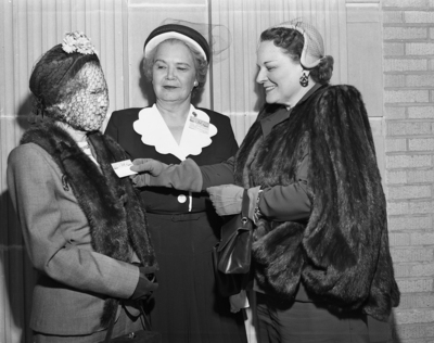 Examining the identification tags given women attending the Texas Federation of Music Clubs convention here are, left to right, Mrs. R. E. Wendland of Temple and Mrs. Few Brewster of Austin, both members of the National Federation of Music Clubs' Board, and Mrs. Bard Paul of Dallas, president of the national organization's Lone Star District, composed of clubs in Texas and Oklahoma.