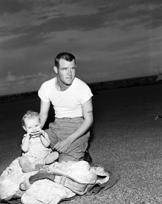 Patricia Stewart, 9 months, chews on daddys parachute ripcord handle. Daddy, Neal Stewart hopes to pull the handle more than 123 times Friday. He's after the world's parachute jump record.