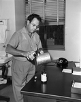 Wayne Garrett, director of health education for the city demonstrates the art of going to war against files. He is loading an ordinary hand operated spray gun with a prepared solution containing pyrethrum and excellent fly killer.
