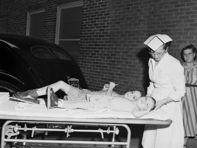 Harris Hospital opened its doors to convalescent polio patients Thursday as two youngsters moved in from City County Hospital. Being received by Mrs. W. H. Williams, pediatrics nurse, are Robert Wagoner, foreground, 3 son of Mr. and Mrs. Robert E. Wagoner, and William Troy McGrath, 6, son of Mr. and Mrs. W. T. McGrath.