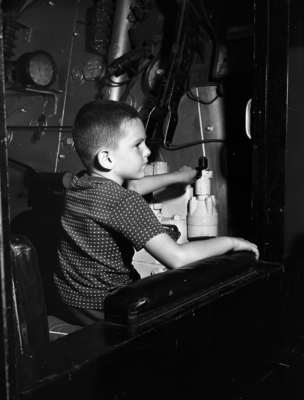 Donny Kilburg, 6 year old son of Mr. and Mrs. Donald Kilburg, tries his hand as engineer of an authentic copy of a Chesapeak & Ohio locomotive which will be on exhibit Monday in Stripling's toy department.