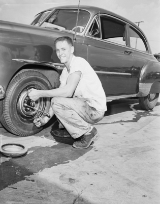 Fred Maples, 17, North Side High end, keeps in shape for football by working at a service station in River Oaks.