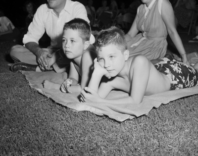 Two boys forgot the hot weather Sunday afternoon ast the band concert at Botanic Gardens. Frederick Lahmer, 6, and Richard, 8, sons of Mr. and Mrs. Richard Lahmer seem to be engrossed witht he light music played by a professional group directed by Andrew A. Davis.
