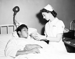 Marshall H. Hernandez, 17, gets a drink of water with the help of nurse, Miss Mary Lou Hicks at St. Josephs Hospital Sunday afternoon, where he is recovering from a self inflicted pistol wound received Sunday after his 18 year old wife, Lillie was slain during a scuffle at the Juarez Hotel.