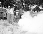 A county fogging machine sends out a cloud of death to flies at Trinity Park Sunday afternoon as Fort Worth Jaycees, left to right, Truett Gillentine, Edwin Dow, Harvey Lucas, Freddie Clark, and H. C. Stanley look on.