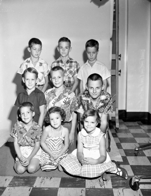 In Carnival - Nine children earned $13 for the Star-Telegram Milk and Ice Fund with a recent carnival held at the home of Mr. and Mrs. E. R. Waddell Jr. of 2833 McGee. The show was sponsored by Tommy Atteberry, Ruth Stearns and Jan Waddell, front row, left to right; Mark Stearns, Jay Beavers and Jimmy Hiett, second row, and Dale Atteberry, Ronnie Hiett and Ray Waddell, back.