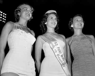 Paula Lane, of Cleburne, the winner of Cats Beauty Contest is shown here in this photograph with two other competitors. Published in Fort Worth Star-Telegram evening edition, July 10, 1952.