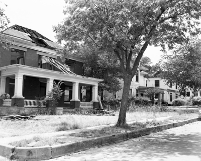 In The Path Of Progress - Three of 51 building to be torn down or moved away as the East-West Freeway pushes eastward across a section ones known as Quality Hill. Row of houses on El Paso Street.