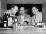 Money For Medicine - Lowell Hudson, left, administrator at City-County Hospital is shown receiving another $100 donation for the depleted B'nai B'rith Medicine Fund there from Louis Luskey, center, president of L. F. Shanblum Lodge of the philanthropic society, as Dr. Frank Cohen, fund chairman, looks on approvingly.