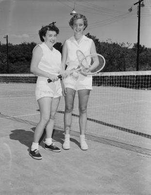 Martha Woodruff, left, and Shirlene Williamson, winners of the city Interscholastic League tennis tournament and representatives of Polytechnic High School in the state tournament, are two of the first to enter the city amateur tennis tournament which opens at Forest Park July 26. Published in Fort Worth Star-Telegram morning edition, July 13, 1952.