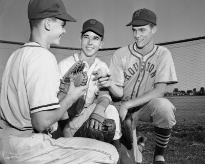 Three-man battery for Jim Hill American Legion team talks plans for bidistrict series. Left to right, catcher Hunter Enis; Harry Taylor, Junior, who will hurl opener at Dallas, and pitcher Richard O' Neal. Published in Fort Worth Star-Telegram morning edition, July 10, 1952.