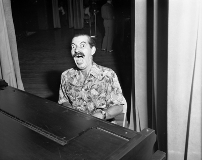 Jerry Colonna is shown singing at a piano. A business man yet. Mr. Colonna is a Hollywood comedian.