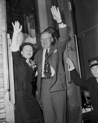 All Smiles - Mr. and Mrs. Jack Porter waved Fort Worth a happy goodby Sunday after a trainside demonstration by Eisenhower backers as a salute to the Houston oil man's victory at the Chicago national convention in getting his delegation seated and aiding in the nomination of the resigned five-star general.