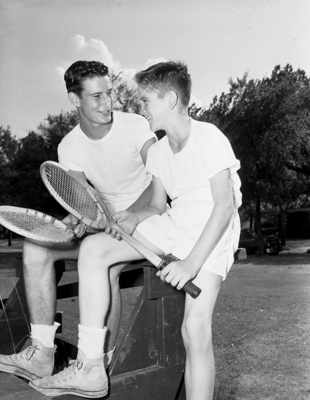 Let's Take 'em - Wendell Grandy, 15, left, and Larry Hammett, 14, talk over plans for city playground tennis tournament starting Monday at Capps Park. They will be doubles partners. Grandy is city junior high singles champion, and Larry of championship doubles team. They are Daggett products.