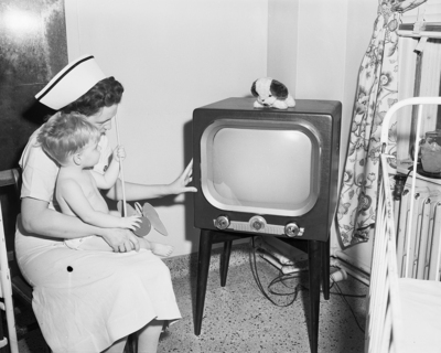 Harris Hospital - New TV Fan - Nineteen-month-old Eddie Wilson, son of L. E. Wilson of Snyder, decides polio isn't so bad as he takes his first look at a television screen in Harris Hospital's convalescent polio ward. Holding him is Miss Lucille Houston, head nurse in the pediatrics division.