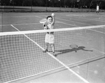 Young Arthur Vaughn, 4-year-old youngster of Dr. J. A. Vaughn, Dallas, takes dead aim before serving practice shot in preparation for coming playground net meet. He's in 7-and-under division. Published in Fort Worth Star-Telegram morning edition, July 16, 1952.