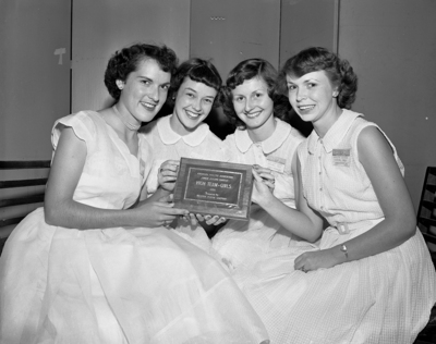 Best Poultry Judges - Left to right, Sue Mash, LaRae Harrell, Mary Lou Cross and Willine Gaston, all from Cushing, Oklahoma, hold the girls team plaque which they won along with first place in 4-H club poultry judging and individual honors at the American Polutry Association's convention here Wednesday.
