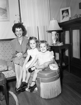 Mrs. Charles H. McCall and daughters, Beverly Jouce, center, and Sandra Kay, after eight months in Ashiya, Japan, with Master Sergeant McCall, are visiting her parents, Mr. and Mrs. A. E. Veal, 2700 College, for a month before going to Long Beach, California, to await the return of their husband and father.