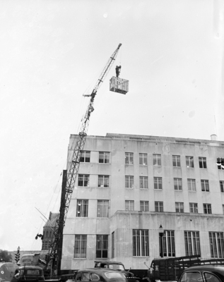 Atomic Age Town Crier - Workmen, with the a ID of a crane, hoist a siren to the top of City Hall. The siren, made especially for air raid warning, will be tested today.