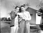 Bob Martin, left, and Hal Hackett, two top men in Texas Tech's golf team, scan score card before teeing off against Texas Christian University (TCU) at Colonial. Frogs of TCU won the tournament. Raiders play Texas Workforce Commission. Published in Fort Worth Star-Telegram evening edition March 30, 1950.