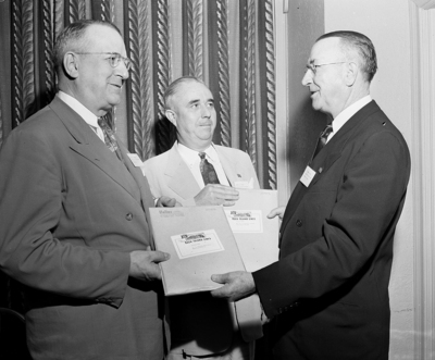 Information on Texas - Two members of group of 50 Rock Island Railroad freight men receive packages of information on Texas from Frank O'kane of Fort Worth, assistant freight traffic manager for the railroad, before beginning a tour of Texas properties. At left is C. P. Varney, executive represntative of the lines from St. Louis and Washington. W. B. Fural, freight traffic manager from Chicago is in the center and O'kane at right.